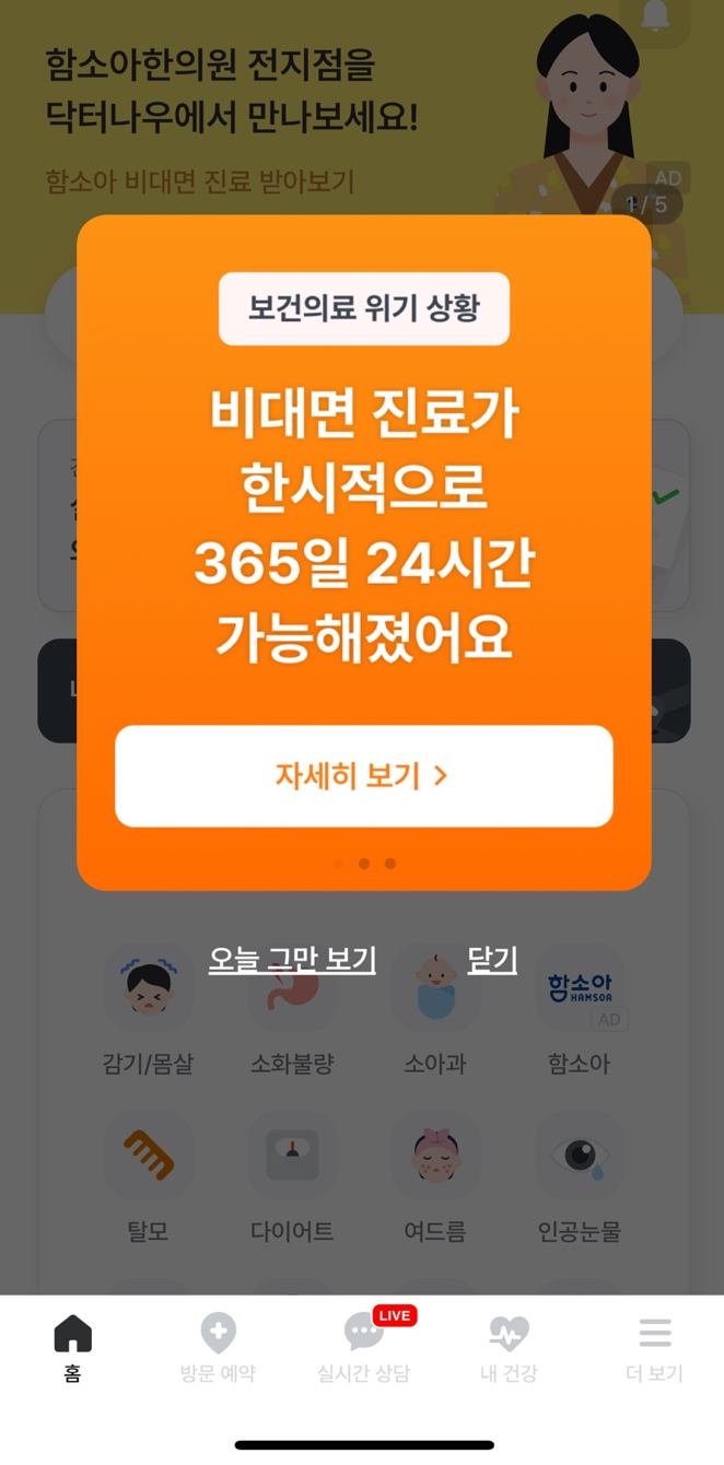 18일 집단휴진 이후, 한시적으로 비대면 진료 범위(24시간 가능)가 대폭 확대되었습니다. 이에 휴대폰 어플로도 간편하게 병의원 비대면 진료가 가능해졌는데요.