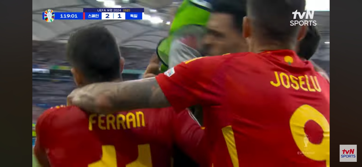 후반 6분: 다니 올모의 골로 스페인이 리드를 잡았습니다. 라민 야말의 어시스트가 제대로 들어왔고 다니 올모의 슛이 그대로 골문 안으로 빨려들어갔네요.