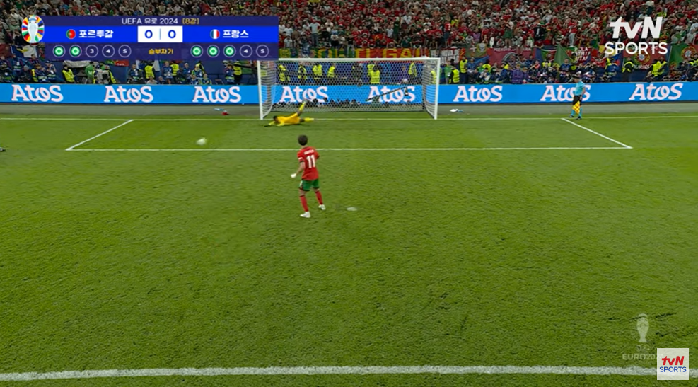 그리고 포르투갈의 세 번째 키커, 주앙 펠릭스의 슛이 골대를 맞고 나오네요. 이미 골키퍼가 방향을 잡고 있었기 때문에 골대가 아니면 골키퍼의 손에 걸렸을 수도 있겠습니다.