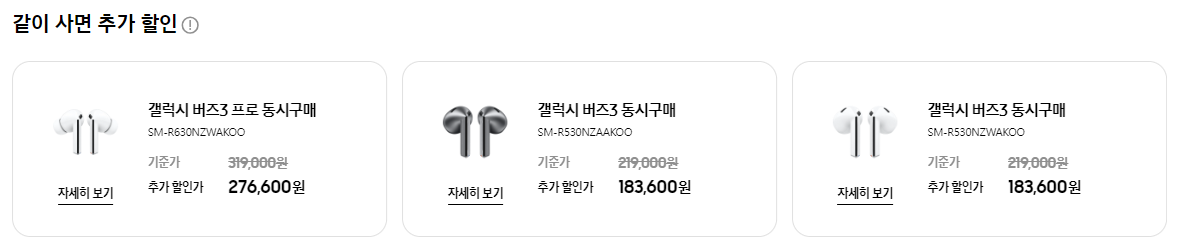 또한, 버즈3/프로와 함께 구매시 추가할인도 해준다고 하니, 구매 계획이 있으신 분들은 참고하시면 좋겠습니다.