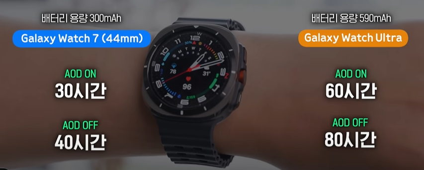 갤럭시 울트라의 배터리용량이 600mAh 에 육박하면서 워치7의 배터리 용량보다 훨씬 더 긴 시간동안 사용이 가능합니다. 여기서 고려할 것은 화면 밝기 역시 울트라가 약 1.5배 밝아져서 (3,000 nit) 오랜시간 디스플레이가 활성화 된 경우 소모량의 차이도 울트라가 더 클 수 있습니다.