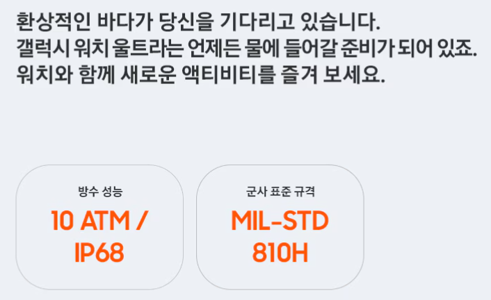 갤럭시 워치7는 수심 50m까지 방수가 가능한 5ATM, 워치 울트라의 경우는 10ATM으로 수심 100m 까지 제공합니다. 사실, 심해까지 잠수할 일이 거의 없는 대부분의 사용자에게 50m와 100m의 차이는 크게 없겠지만, 기능적으로 워치 울트라가 컨셉처럼 '극한의 도전'에 특화된 것 만큼은 분명합니다.