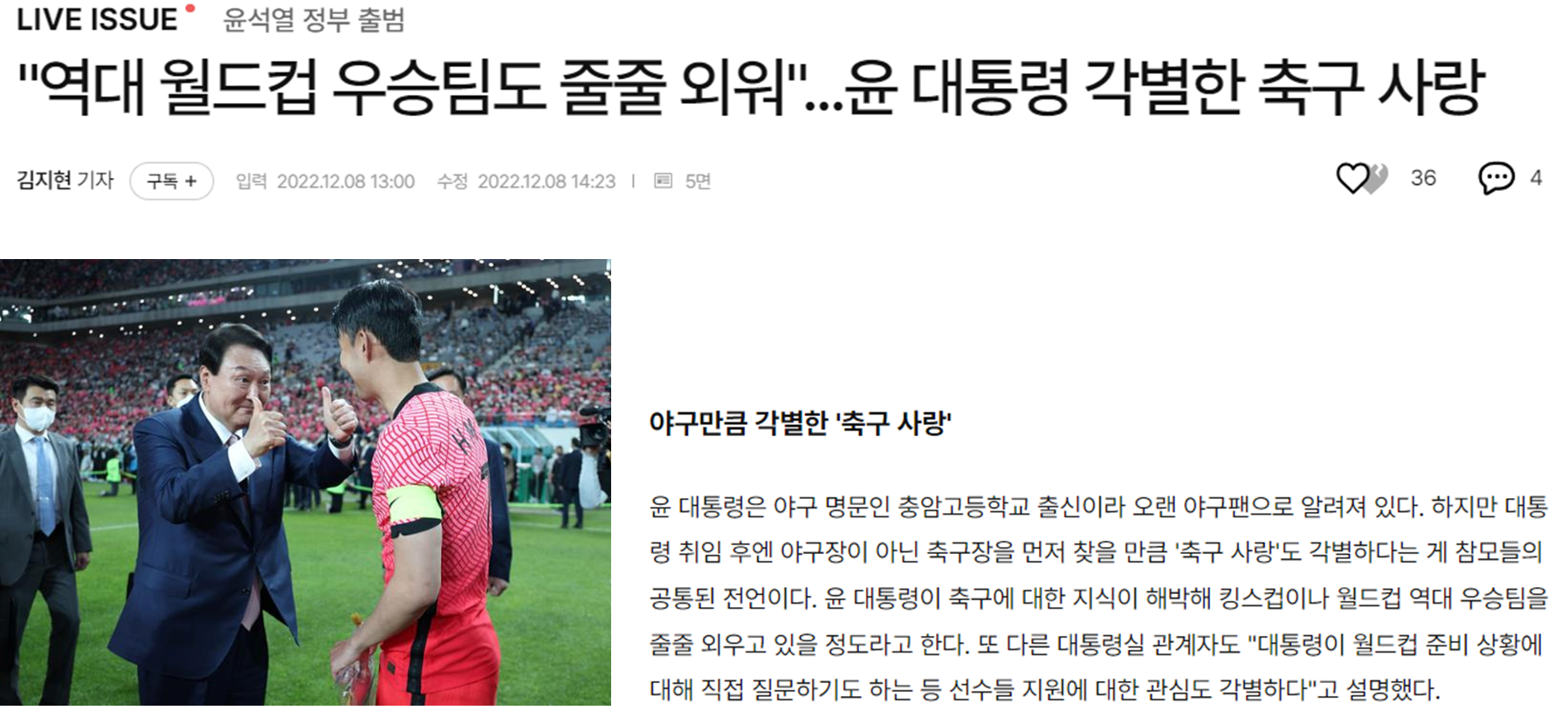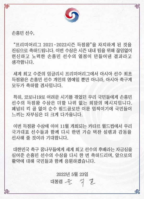 윤석열 대통령 역시, 국민들이 느끼는 손흥민과 한국축구에 대한 자부심에 무게를 실어 메세지를 전달했었고. 손흥민을 비롯해 대한민국의 위상을 높인 축구와 축구인들, 그리고 축구팬들로 부터 자유로울 수 없을 것입니다.