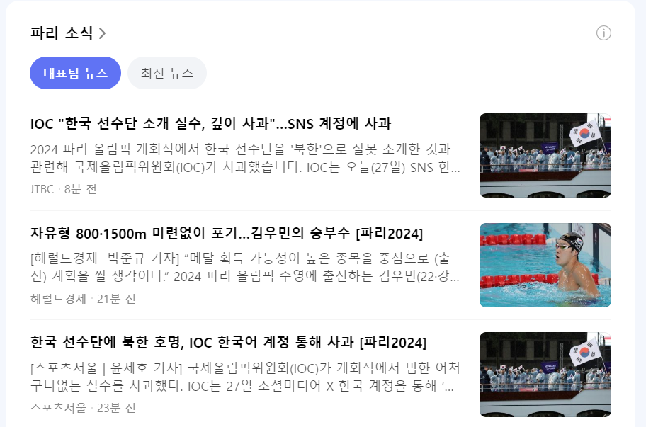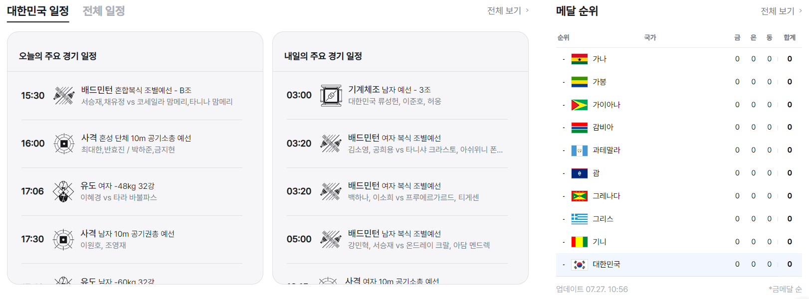 다음도 파리올림픽 특집 페이지(GO! PARIS)를 통해 주요 경기 일정과 결과, 실시간 올림픽 관련 주요 뉴스를 전달합니다. 역시 네이버와 비슷한 포맷의 정보들이 수록되어 있습니다.