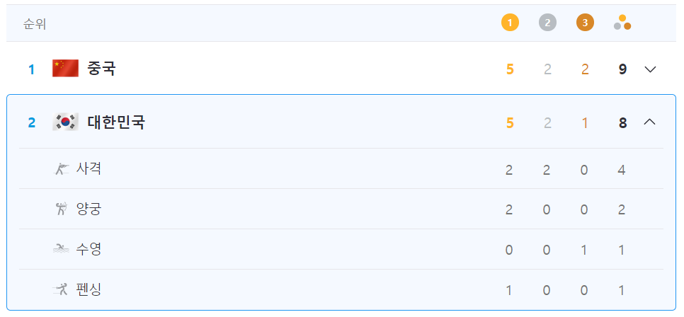 2024 파리올림픽 5일차 대한민국 성적 | 금메달 5개, 종합 2위