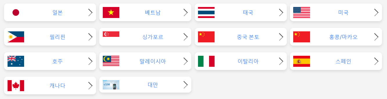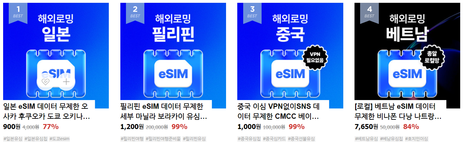 이심(eSIM) 로밍만 고려한다면 한번쯤 확인해보셔도 될 것 같습니다. 최근 인기있는 주요 여행지의 다양한 이심 상품을 보유하고 있고, 가격도 경쟁력이 있어보입니다.