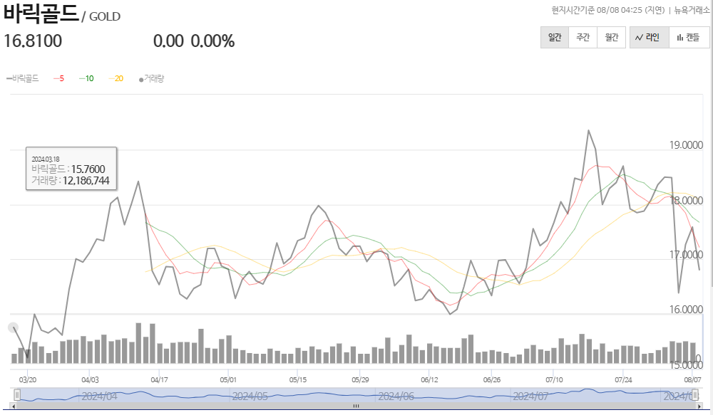 캐나다 토론토에 본사를 둔 세계 최대의 금 생산 회사 중 하나입니다. 1983년에 설립된 Barrick Gold는 금, 구리, 실버 등의 광물 자원을 탐사, 개발 및 생산하는 글로벌 광업 회사입니다. 연간매출은 약 120억 달러(2023) 입니다.