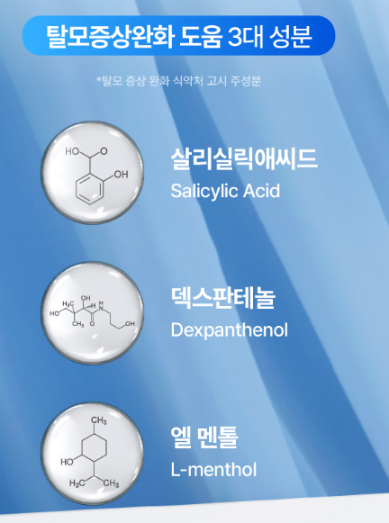 또한 이 제품에는 살리실릭애씨드, 덱스판테놀, 엘멘톨 등 탈모 증상 완화에 도움을 주는 대표적인 성분을 함유하고 있다고 합니다.