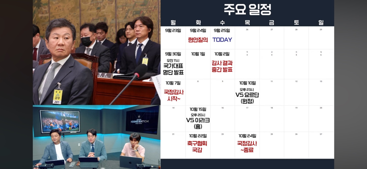 10월 24일까지 진행되는 국정감사 기간동안 실제적으로 불법, 위법의 소지가 있는 모든 이슈들을 다루게 될텐데요. 22일 예정된 축구협회 국정감사에서 거의 정점을 달할것으로 보입니다.