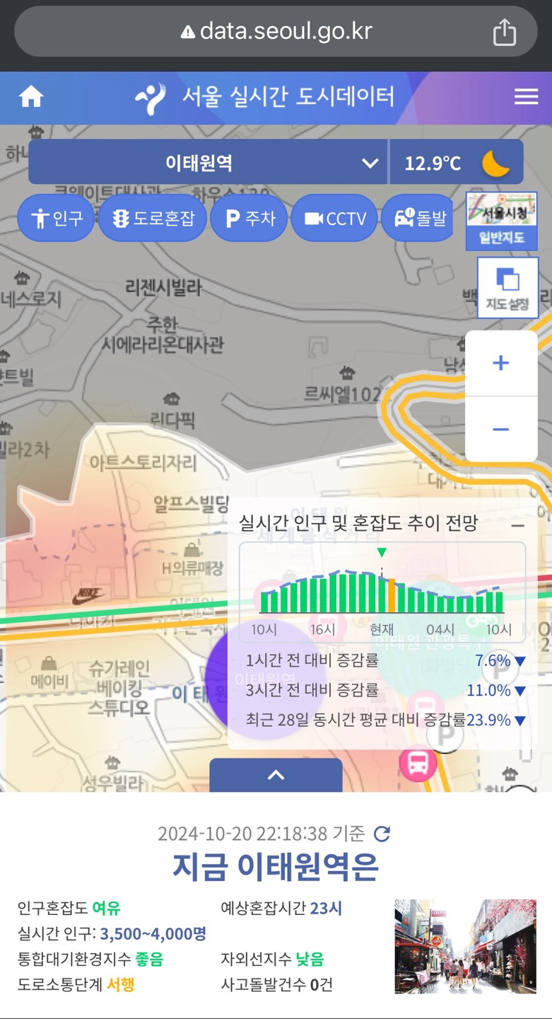 바로 서울 실시간 도시데이터 사이트인데요. 이 사이트에서는 실시간으로 홍대나 강남, 이태원 등 주요 상권의 유동인구, 차량과 주차 혼잡도 등 주요행사 당일의 밀집도 정보를 제공해주고 있습니다.