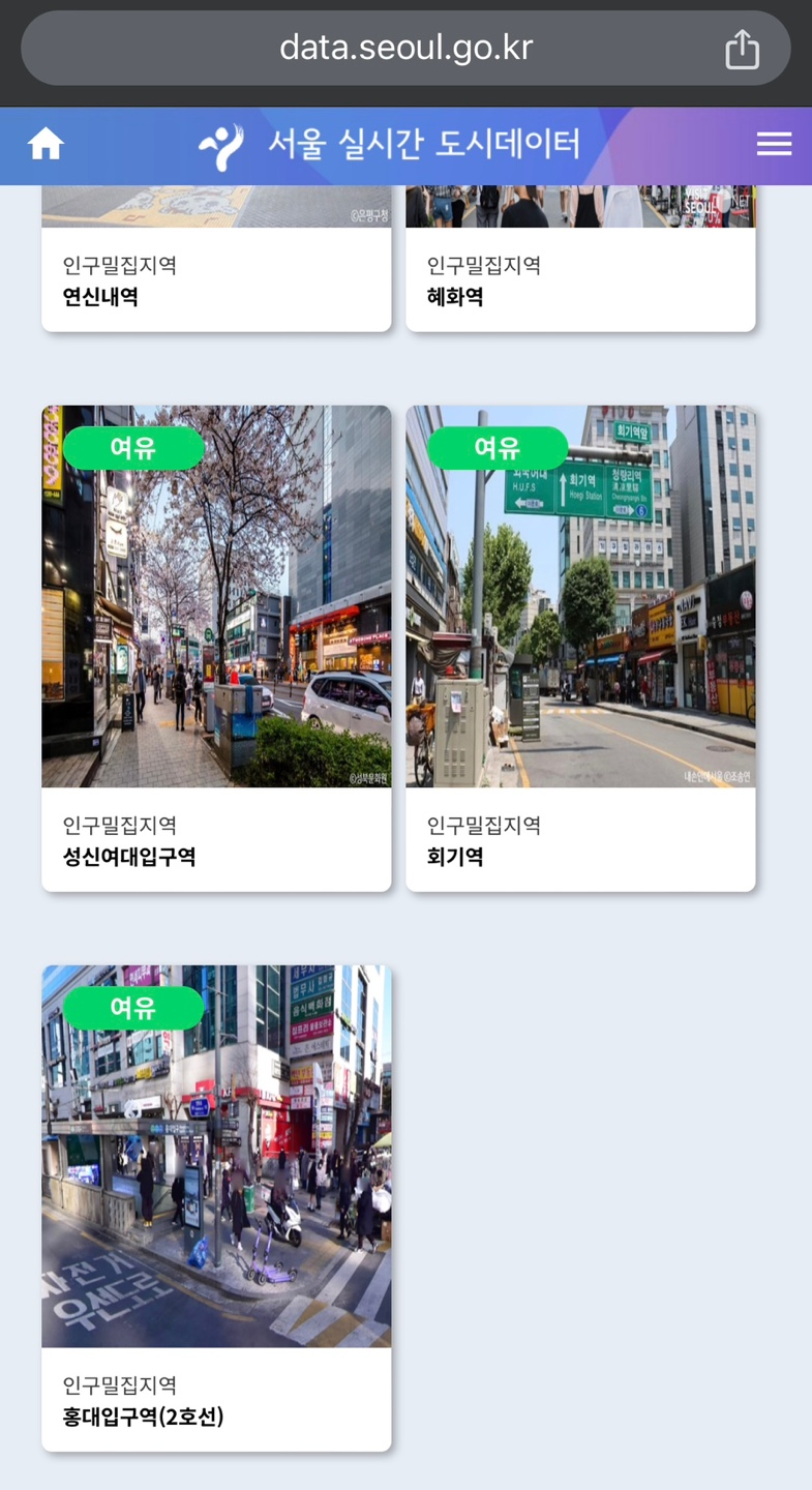 바로 서울 실시간 도시데이터 사이트인데요. 이 사이트에서는 실시간으로 홍대나 강남, 이태원 등 주요 상권의 유동인구, 차량과 주차 혼잡도 등 주요행사 당일의 밀집도 정보를 제공해주고 있습니다.