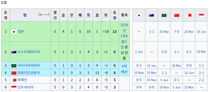 11월 15일 현재 B조는 대한민국, A조는 일본이 1위를 기록하며 월드컵 본선 진출 가능성이 상당히 높아져 있습니다. 거의 확정적이라고 보아도 좋을 상황인데요. C조의 중국이 2승이나 기록했다는 점이 조금 놀랍네요 🙄