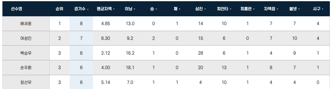 5경기 이상을 소화한 투수들의 경우에도 16.2 이닝을 던진 백승우 (평균자책 2.12)를 제외하면 4.0 이상의 평균자책을 기록할 정도로 정현우나 정우주, 강민구(왕중왕전 3.60) 등의 투수들 보다는 위압감이 덜 할 것으로 보입니다.