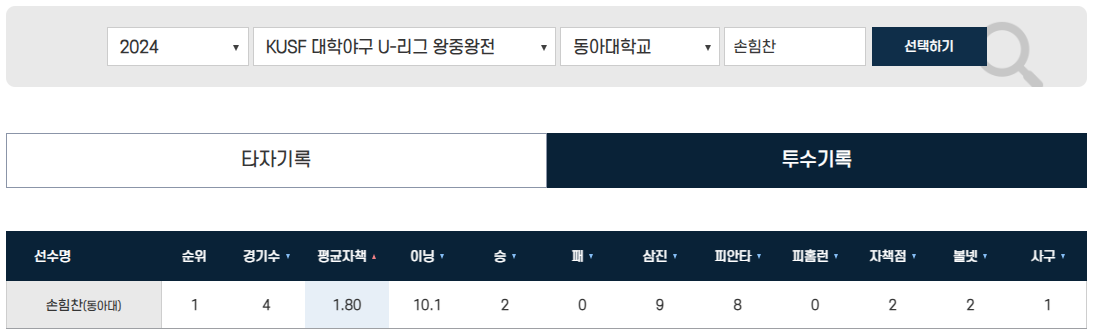 2024 대학야구 왕중왕전 총 4게임, 10.1이닝 평균자책점 1.80으로 굉장한 성적을 기록하며 팀을 우승으로 이끄는 기여를 하기도 했죠. 리그 결승전이 9월 말이었으니, 10월 28일에 열린 최강야구와의 경기에도 마운드에 등장할 것으로 예상됩니다.