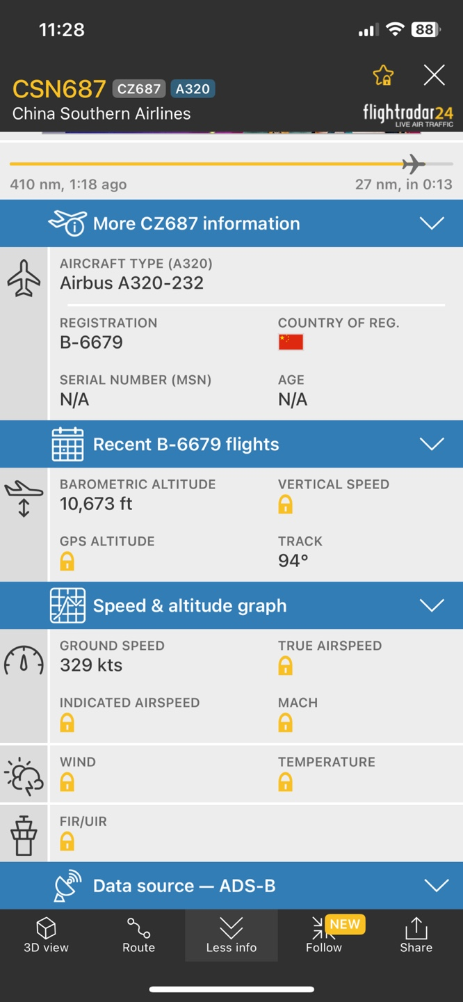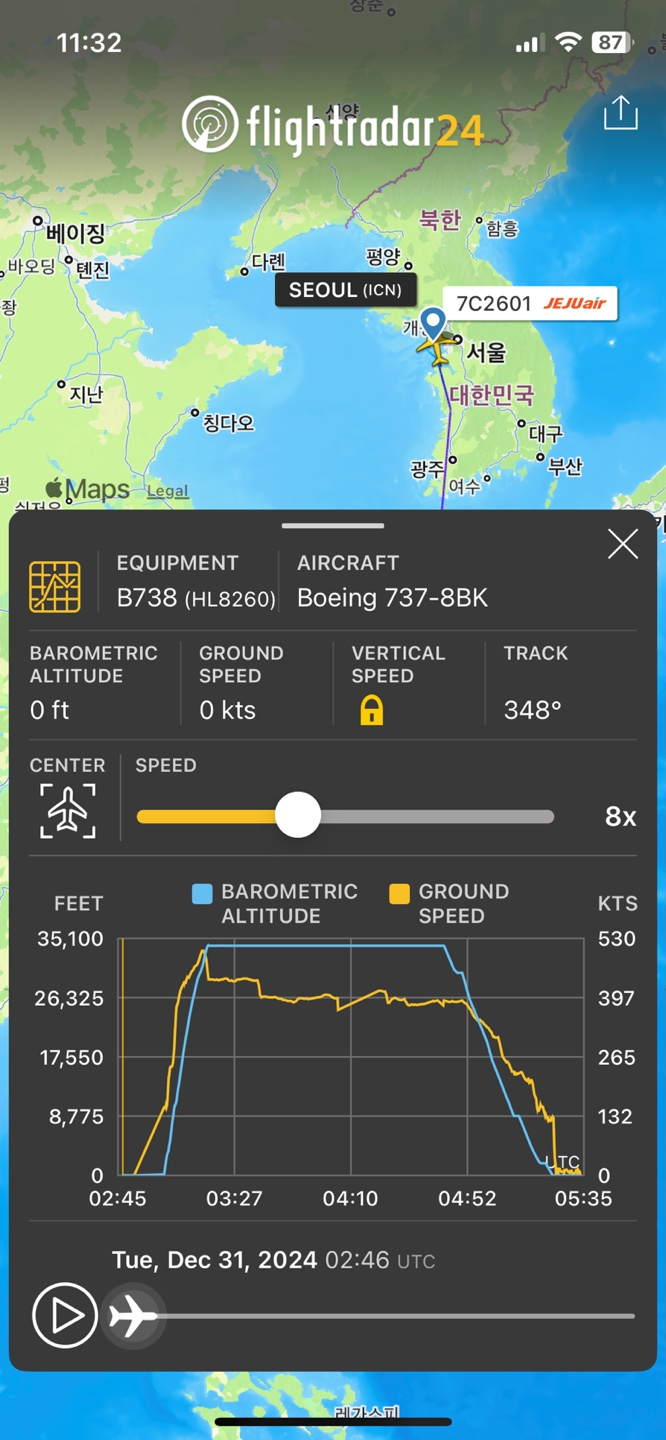 해당 항공편의 상세보기로 넘어가면 해당 항공편이 현재 어느 높이에, 어떤 속도로 이동중인지, 날짜별로 어떤 경로로 운항했었는지 그 이력들을 확인할 수 있습니다.