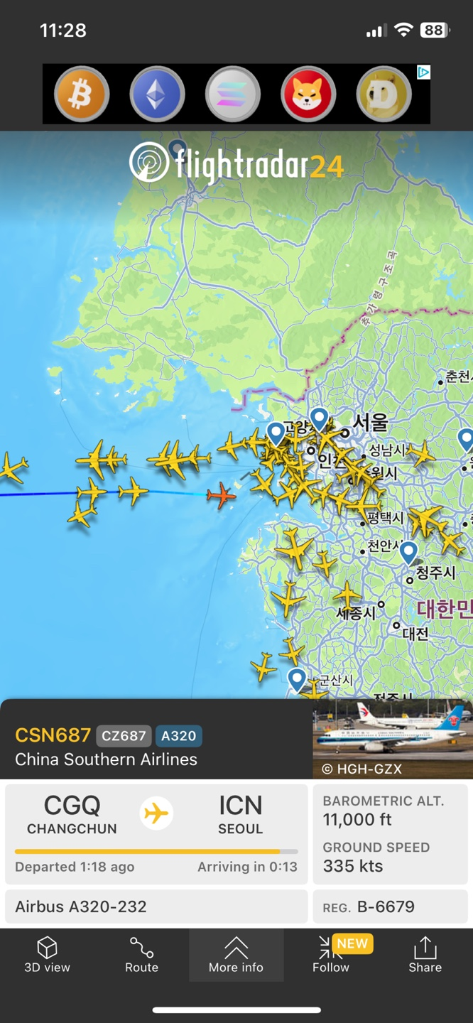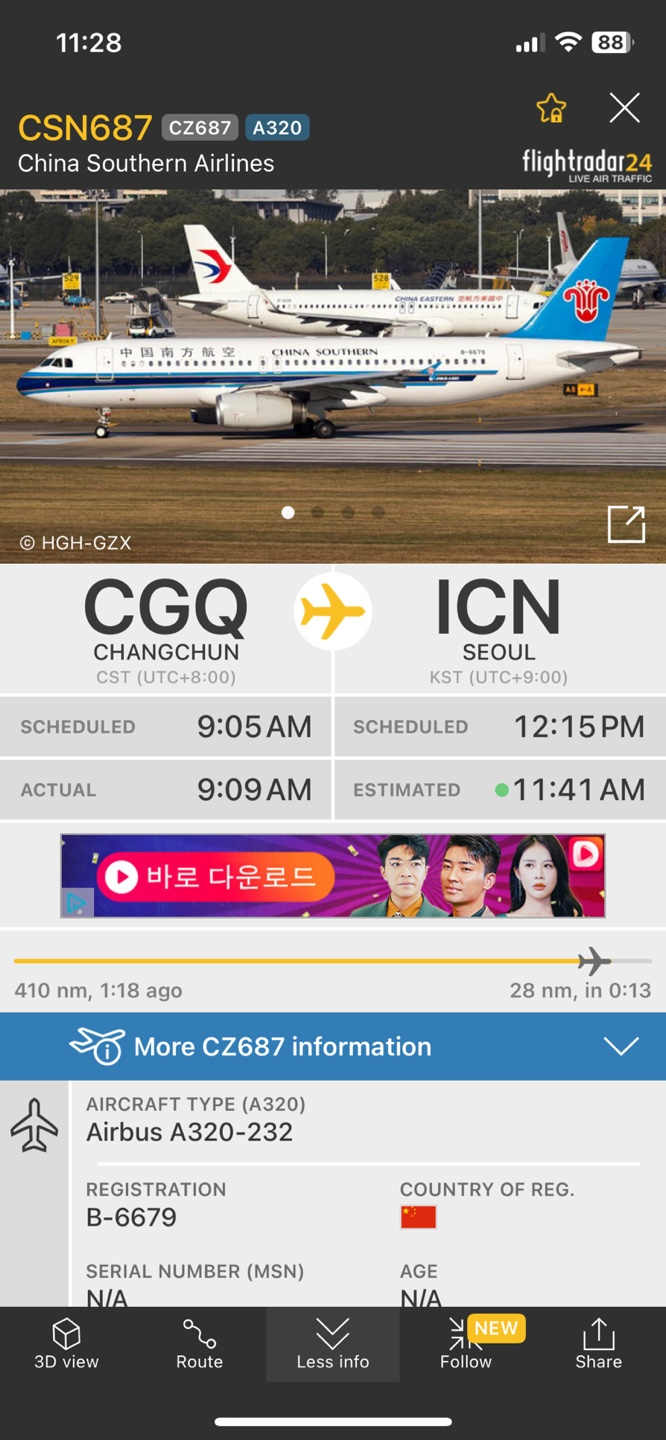 검색창에 항공편 번호를 입력하거나 위의 이미지처럼 지도상의 항공편을 선택하면 해당 항공편에 대한 정보를 실시간으로 확인할 수 있는데요.