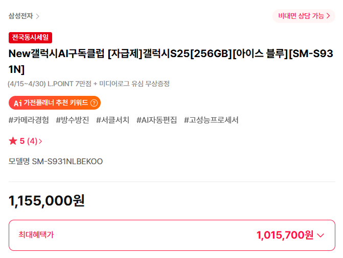 | 갤럭시 S25 | 1,292,000~ | 61,000~378,400원 | 61,000~378,400원 | 25만 원 내외 할인(번들 기준) |