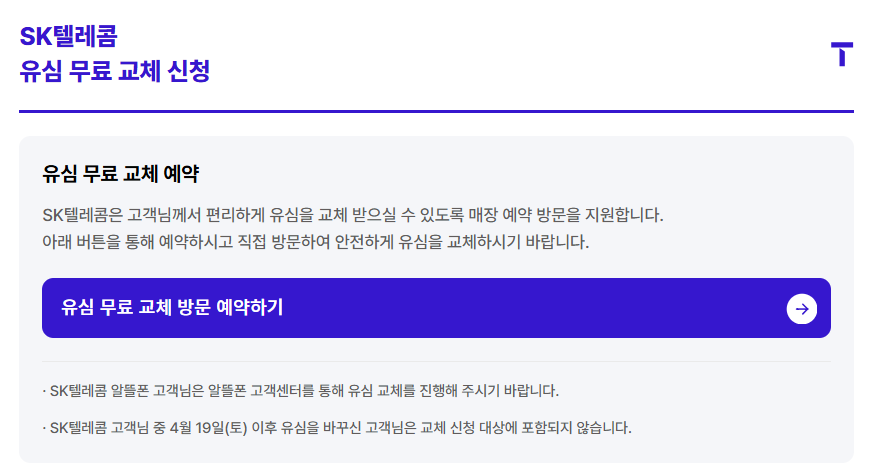 - 무상 유심 교체 : 5월 31일까지 전국 T월드 매장에서 가능