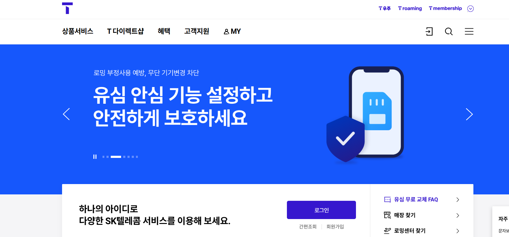 T월드 홈페이지 초기 화면 배너나 검색 포털에서 ‘SKT 유심 교체 예약’을 검색해도 접속할 수 있습니다.
