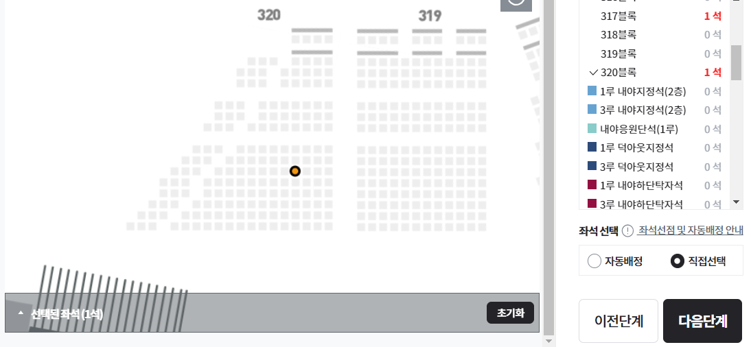 저는 320 블록에 남아있는 좌석 하나를 선택할 수 있었습니다. (혼자니까요....) 왠지 결제에 임박한 기분이 듭니다.